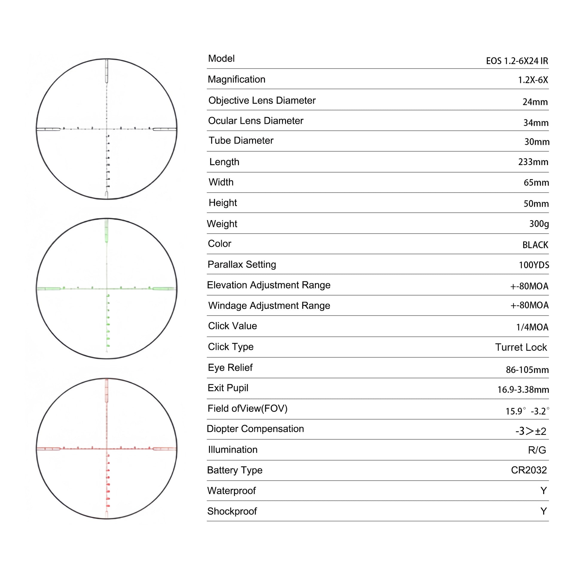 Featuring HD multi-coating technology and a 24 mm objective lens, the EOS 1.2-6×24 IR offers sharp contrast, vivid colors, and excellent light transmission — ideal for both daylight and low-light conditions.